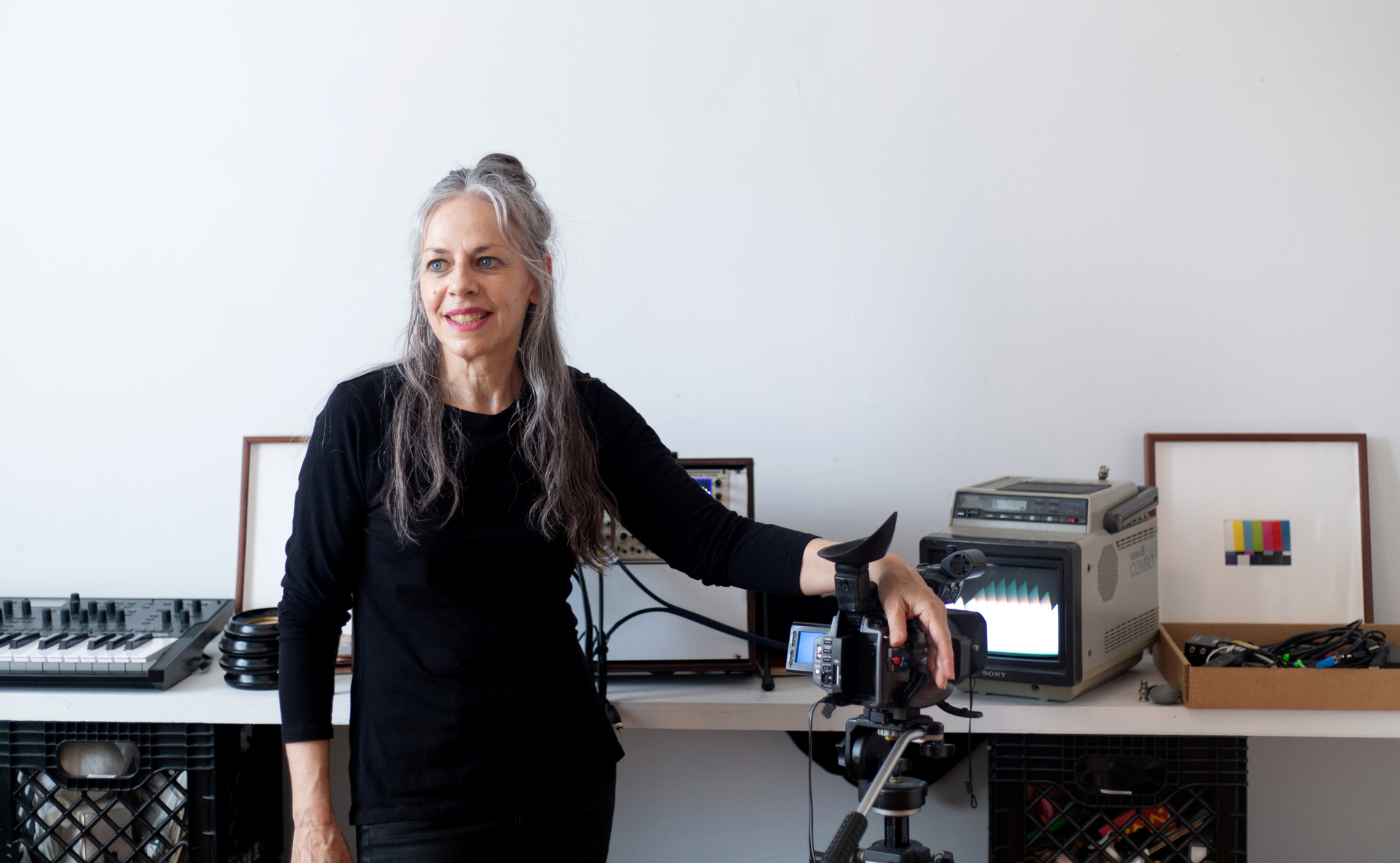 Réalisée à l’aide d’un synthétiseur vidéo, l’un des premiers appareils utilisés lors de performances en art vidéo, l’œuvre Pixels, petits points et monument rend hommage à l’histoire de cette discipline, mais aussi à celle de la peinture abstraite et de l’art textile. Dans un espace où les lignes ploient jusqu’à devenir des courbes, puis des cercles fermés, les formes se changent en compositions numériques qui ont tout d’une peinture et qui imitent à s’y méprendre la texture d’une tapisserie.